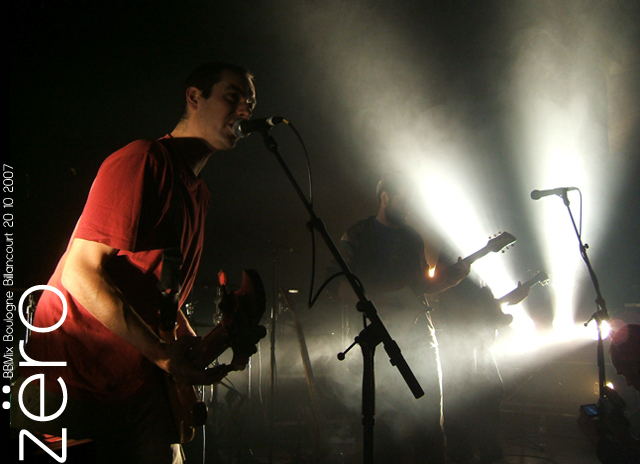Le concert de Zëro a beau avoir lieu en période de grève, alors que le thermomètre commence à atteindre des niveaux hivernaux, nous ne voulons pas manquer leur premier concert parisien depuis la sortie de leur album. La salle est située dans les entrailles de Boulogne-Billancourt, au milieu d'une résidence seventies qui donne l'impression d'être dans une station de ski mal-foutue ! Pas franchement ce qu'il y a de plus charmant… Avec nos deux heures de retard, nous avons loupé le duo Rrose Tacet et le collectif pop Lanscape qui finit son dernier morceau quand nous arrivons. Le temps de se réchauffer avec une bière, de causer un peu avec les quelques amis présents, et les quatre anciens Bästard montent sur scène. Quel plaisir de revoir leurs tronches… c'est impressionnant comme Éric Aldéa n'a pas changé… Dix bonnes années ont passées quand même et l'homme me renvoie de suite aux dernières prestations de Bästard. Rien à faire, ce groupe m'a marqué. Alors, que donne cette nouvelle formation sur scène ? Que donne la "joke box" (nom de leur premier album) en live ? La salle est à demi-pleine quand la ligne de basse irrésistible de Big Screen / Flat People entre en action. On y est. Zëro nous renvoie direct à ces si bonnes années 90. Malheureusement, le micro est coupé, et les quelques lignes de chant d'Aldéa ne pourront être entendues… Ça énerve le monsieur… Tant mieux, les lyonnais ne sont jamais aussi bons que quand ils mettent un peu de tension, évitant ainsi la béatitude post-rock. De l'autre côté de la scène, le guitariste (qui deviendra bassiste) offre le minimum, sans passion. Idem derrière le clavier, dans l'ombre. Seul Franck Laurino, le batteur y met du sien, avec ses rythmiques typiques.