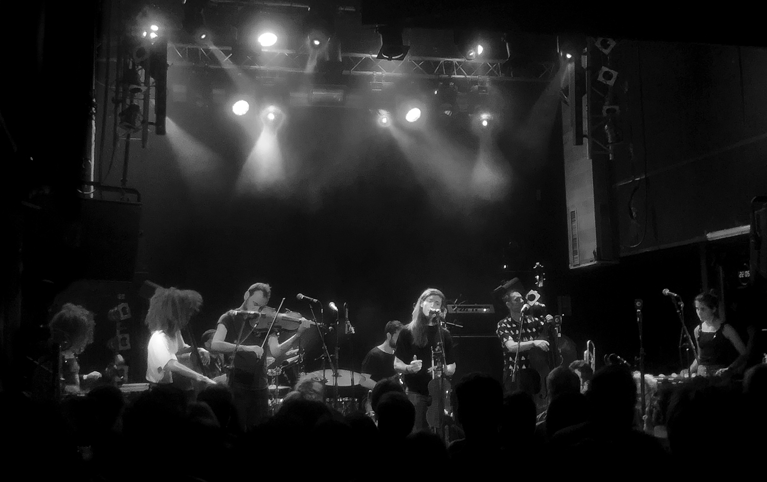 Pause. La vraie raison de notre venue s’installe maintenant. Il faut imaginer douze musicien.es sur la petite scène de Petit Bain. Il reste peu d’espace vide, mais le groupe, que dis-je, l’orchestre, semble réparti de manière précise, maline. Vincent Bertholet, le compositeur-organisateur-contrebassiste de la troupe, supervise au fond à droite, comme souvent. Dans cet ensemble hétéroclite, les cheveux raides se mélangent aux chevelures bouclées, comme les rockers cohabitent avec les jazzeux, et les guitares électriques avec les violons et les marimbas. Cette grande foire s’imbrique parfaitement, laissant s’évader une musique pleine de grâce et de folie. La technique, pourtant si présente, disparait au profit de la danse, et de la communion. Les morceaux sont millimétrés et pourtant si organiques (la quasi totalité du dernier album y passe, ainsi que quelques tubes du précédent). Les groupes punk The Ex et Dog Faced Hermans ont définitivement fait des petits qui volent maintenant bien loin de leurs maîtres. Serait-ce un Brass Band de la Nouvelle Orléans ? Un souvenir des Anglais de Spaceheads (dans lequel Vincent a joué) qui aimaient s’amuser avec le groove comme cet orchestre-là ? Du post-punk ? Du jazz dada-iste ? C’est surtout loin des étiquettes que ceux là s’épanouissent. Prenant la beauté là où elle se trouve, invoquant parfois Steve Reich et glorifiant la force du collectif. Les chants féminins nous transportent, sublimes, quand les vocaux plus martiaux des hommes nous galvanisent. Le public ne s’y trompe pas, petit à petit tout le monde ondule, déhanche, et se met à danser. Pas facile pour les rockers parisiens, mais OTPMD a l’habitude. Leur musique s’envole et s’épanouit, plus encore que sur disque. Personne ne résiste à cette déferlante aussi énergique que réconfortante. Merci mille fois à Petit Bain et à ces cousins éloignés de Marcel Duchamp pour ce moment si chaleureux et tellement humain, évitant tous les pièges du genre. Définitivement Tout Puissant !